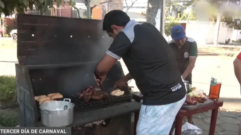 Las comparsas del centro de la ciudad mantuvieron viva la tradición gastronómica en el tercer día de festejo, compartiendo el churrasco típico con visitantes locales y extranjeros en un ambiente de confraternización.