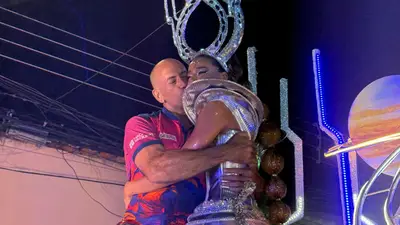 Durante el recorrido, el padre de Camila I se acercó al carro alegórico de la reina y, ante la mirada de miles de personas, subió a la imponente estructura para abrazar a su hija. Camila lo recibió con una sonrisa sincera y visiblemente conmovida, sellando un instante que despertó aplausos y gestos de emoción entre el público.