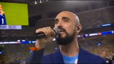 Abel Pintos le puso la voz al himno argentino, en la previa de la final de la Copa América, el artista entonó con gran entusiasmo y afinación la melodía, mientras en las graderías sus coterraneos tambien lo hacían a viva voz.