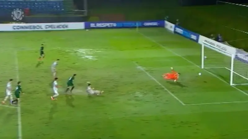 Momento cuando Nacif saca el disparo y el balón se va a guardar al fondo del arco argentino. Foto: captura del video de la transmisión oficial subida a su cuenta oficial de Conmebol (Facebook).