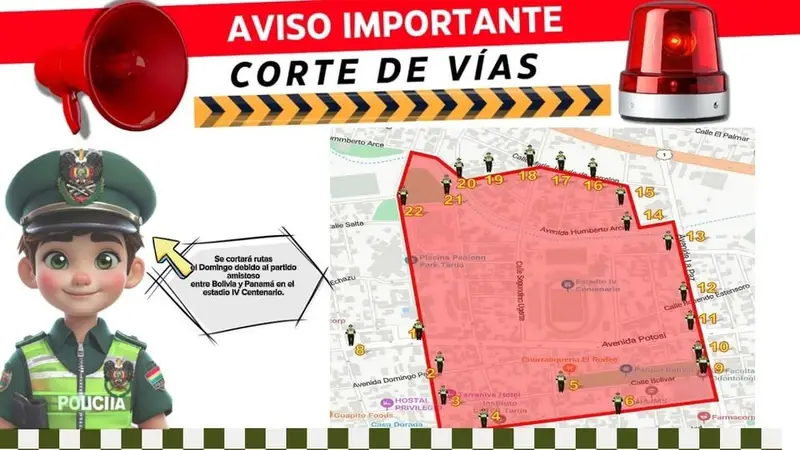La policía boliviana de Tarija informó cuáles serán los puntos de corte en la ciudad para el buen desarrollo del partido entre Bolivia y Panamá, este domingo desde las 17:00 en el estadio IV Centenario.