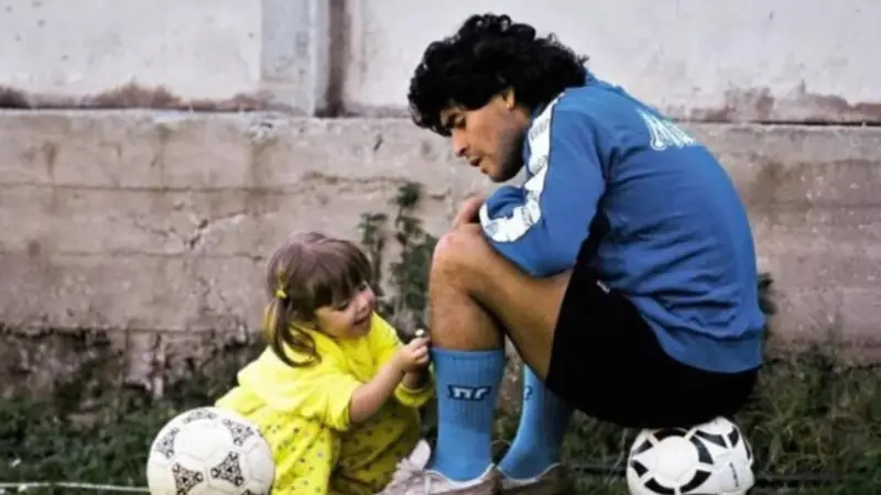 Entre todas las imágenes del álbum, hay una que considera la más especial: una foto de Maradona junto a su hija Dalma, durante un entrenamiento en Napoli, mientras ella le coloca pequeñas margaritas en las medias.