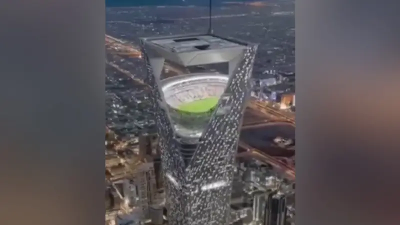 En las últimas horas se ha viralizado por redes sociales como X y Facebook un fragmento de 10 segundos en el que aparece un estadio de fútbol situado en la cúspide de un edificio a varios centenares de metros sobre el suelo, y que los mensajes vinculan con una sede del Mundial.