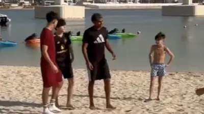El jugador, de 18 años, se encuentra en la ciudad emiratí durante el periodo vacacional, aprovechando su tiempo libre para realizar actividades recreativas alejadas de la competencia oficial. En las imágenes se lo observa compartiendo de manera espontánea con niños de distintas edades, jugando fútbol sobre la arena y demostrando cercanía y sencillez fuera de los estadios.