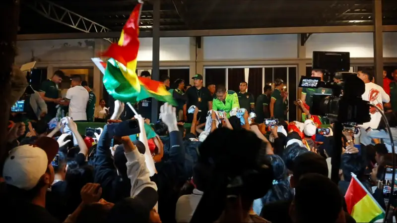 La noche de este sábado, los hinchas de la selección boliviana protagonizaron un multitudinario banderazo chapaco en Tarija, donde expresaron su respaldo a la Verde con cánticos, arengas y banderas en las afueras del hotel de concentración.