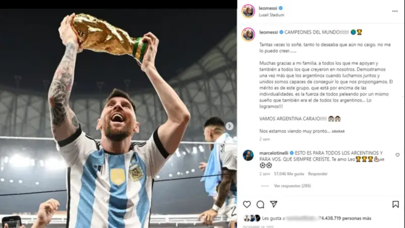 Las icónicas y virales fotos de Lionel Messi levantando la Copa del Mundo en Qatar junto a la selección de Argentina ya le han dado la vuelta varias veces al planeta. En especial, las que compartió en su cuenta de Instagram, en la que se le ve cargado en hombros sujetando el preciado trofeo. La publicación ha tenido tal resonancia que la publicación se ha convertido en la más popular de la historia de la red social, llegando casi a los 75 millones de "me gusta".