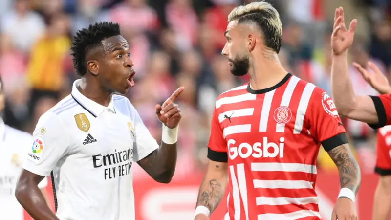 El delantero Vinicius Júnior de Real Madrid tiró un caño y filtró la pelota entre las piernas del defensor Arnau Martinez de Girona a los 12 minutos de la primera etapa.