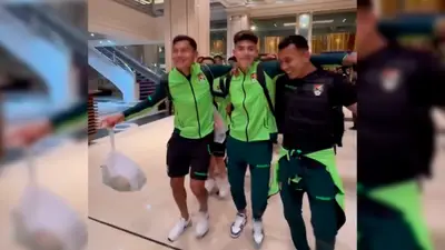 La alegría de los jugadores bolivianos desbordó en Santiago. Al ingresar, el renovado equipo dirigido por Óscar Villegas, ingresó bailando ‘La Bomba’, el emblemático tema de Azul Azul.