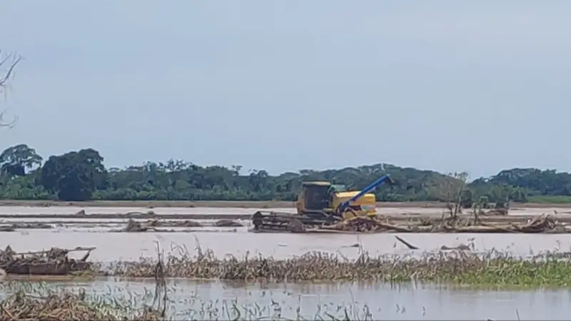 Pequeños productores de la comunidad Faja Norte, en Yapacaní, se declararon en emergencia luego de que el desborde del río cubriera de lodo y arena gran parte de sus cultivos, dejando incluso maquinaria agrícola atrapada entre el agua y el sedimento.