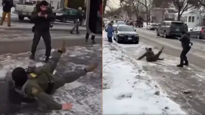 Un agente del Servicio de Inmigración y Control de Aduanas de Estados Unidos (ICE) en Minnesota tuvo un momento muy curioso mientras perseguía a un inmigrante. Durante la redada, el oficial corrió por la calle, pisó hielo y se cayó de espaldas. Varias personas que estaban cerca se rieron y aplaudieron.