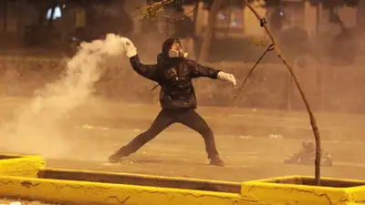 Al caer la noche, grupos de manifestantes intentaron avanzar hacia el Congreso y derribar las vallas de seguridad. La policía respondió con gases lacrimógenos, escudos y bastones, en medio de una lluvia de piedras y fuegos artificiales lanzados por algunos asistentes.