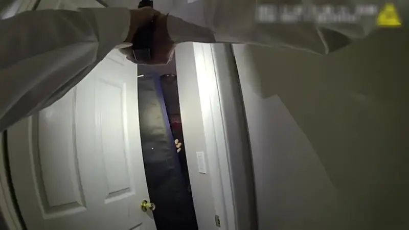 El video de la cámara corporal (AXON BODY 4) muestra al oficial con el arma desenfundada y la linterna apuntando hacia una puerta cerrada. Se pueden escuchar claramente las órdenes policiales hacia el interior de la habitación: