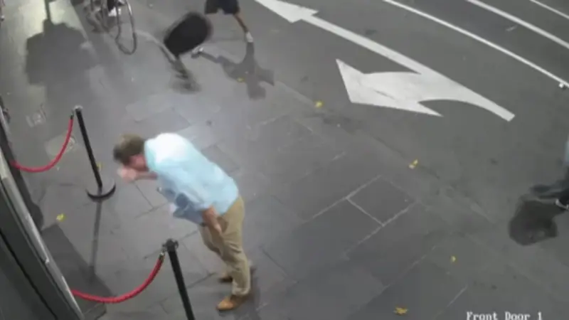 El insólito momento quedó registrado por cámaras de seguridad de un club nocturno en Melbourne, Australia, y se viralizó en redes sociales por el inesperado desenlace del ataque.