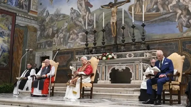El papa León XIV y el arzobispo de York, Stephen Cottrell, presiden en la Capilla Sixtina en el Vaticano la oración ecuménica dedicada a la defensa del medio ambiente en la participan los reyes de Reino Unido, Carlos III y Camila, un evento histórico que se produce casi 500 años después de la reforma anglicana.