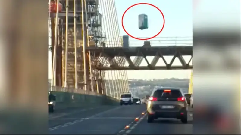 En las impactantes imágenes se ve cómo la cabina de aseo portátil se desploma mientras es trasladada por una grúa en las alturas del puente.