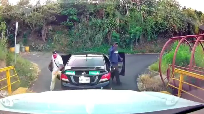 El incidente, captado íntegramente por la cámara de seguridad (dashcam) del vehículo afectado, ocurrió cuando un automóvil negro se detuvo abruptamente al finalizar el cruce de un puente estrecho. En ese momento, dos hombres armados descendieron rápidamente de las puertas traseras del coche negro, apuntando directamente al conductor que venía detrás para obligarlo a detenerse.