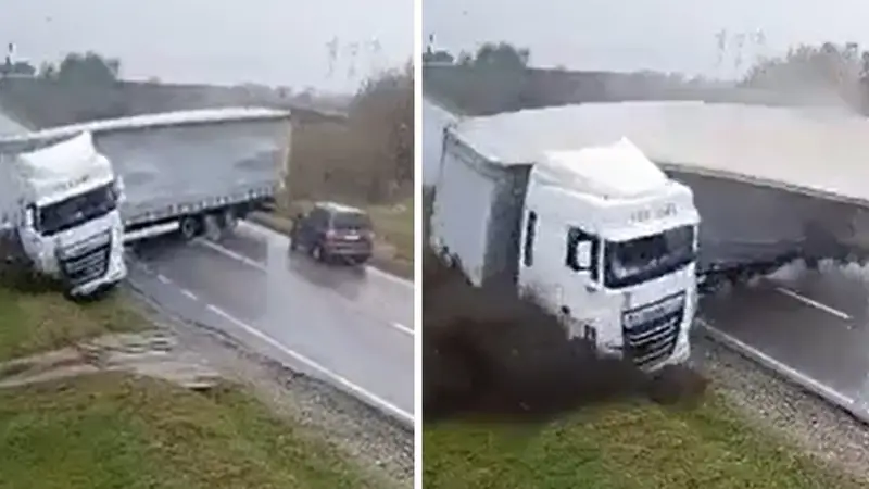 Un video que circula en redes sociales muestra cómo un camión que transitaba por una carretera en Rumanía perdió el control debido a la lluvia, volcándose y aplastando un automóvil con dos ocupantes. La fuerza del impacto fue tal que ambos, conductor y pasajero del coche, murieron en el lugar del accidente.