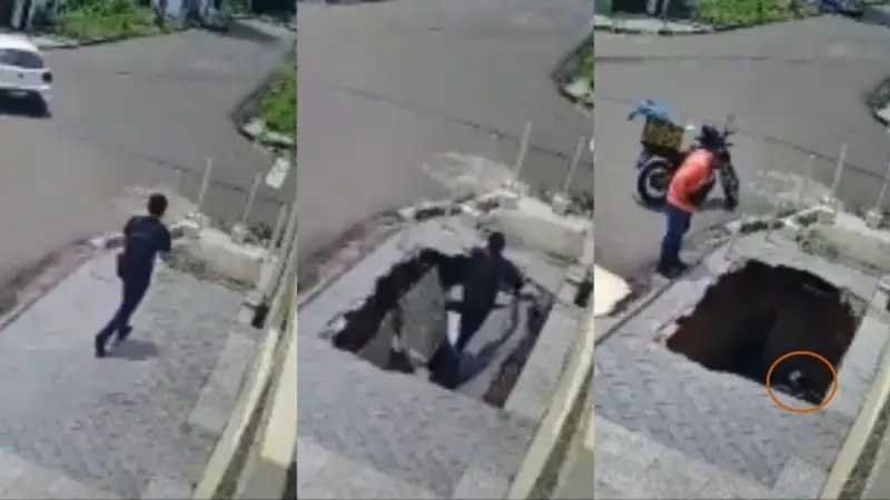 El incidente, captado por una cámara de seguridad, muestra al peatón avanzando por la acera sin sospechar el peligro. De un momento a otro, el suelo cede y el joven cae en un enorme cráter.