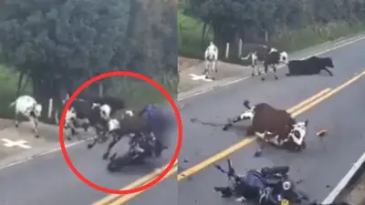 En las imágenes se observa el momento exacto en el que un grupo de vacas invade repentinamente la vía, provocando que un motociclista que circulaba por la zona no pudiera reaccionar a tiempo, colisionando violentamente contra uno de los animales.