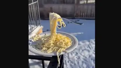 Un impactante video viralizado en redes sociales ha capturado el momento exacto en que un plato de pasta se congela instantáneamente en el aire al ser expuesto a la intemperie en Minneapolis, Estados Unidos. Este fenómeno visual es el resultado de una gélida jornada donde el termómetro marcó los -21 grados, alcanzando una sensación térmica extrema de hasta -45 grados bajo cero.