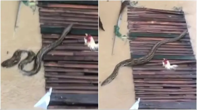 En medio del caos, un hecho llamó especialmente la atención: una serpiente gigante fue vista nadando entre las calles inundadas, desplazándose sobre techos y pasando junto a bodegas mientras las corrientes arrastraban todo a su paso.