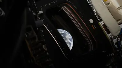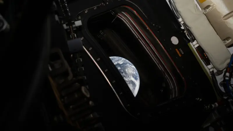 En una de las imágenes, la Tierra aparece parcialmente visible desde una de las ventanas de la nave, generando una escena simbólica del vínculo entre la humanidad y la exploración espacial.