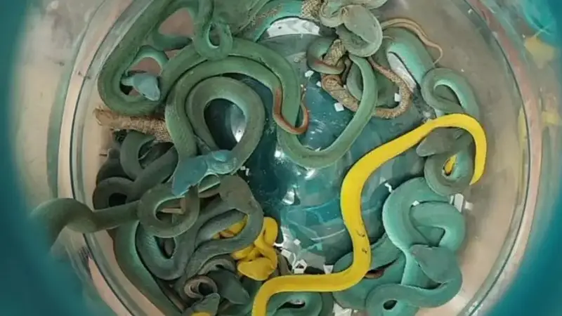 La oficina de aduanas de Bombay informó del hallazgo el domingo a través de X, donde también publicó fotografías de los animales incautados, entre ellas 44 víboras de fosetas de Indonesias, especie de color azul y peso ligero.