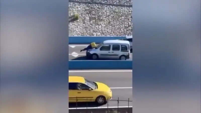 Los videos difundidos en redes sociales muestran al repartidor intentando mantenerse sobre el capot mientras los vehículos que circulaban a su alrededor maniobraban para evitar el accidente.