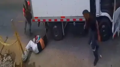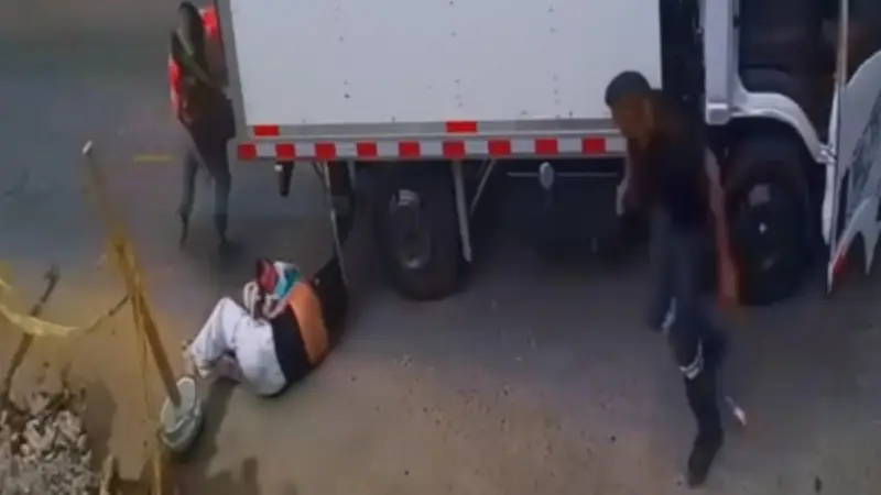 En cuestión de segundos, la mujer queda debajo del camión. Desesperada, logra rodar para evitar ser aplastada por una de las llantas delanteras mientras, con su propio cuerpo, protege al bebé que sostiene entre sus brazos. El conductor, al percatarse del peligro, frena de inmediato y desciende junto a su copiloto para auxiliarlos.