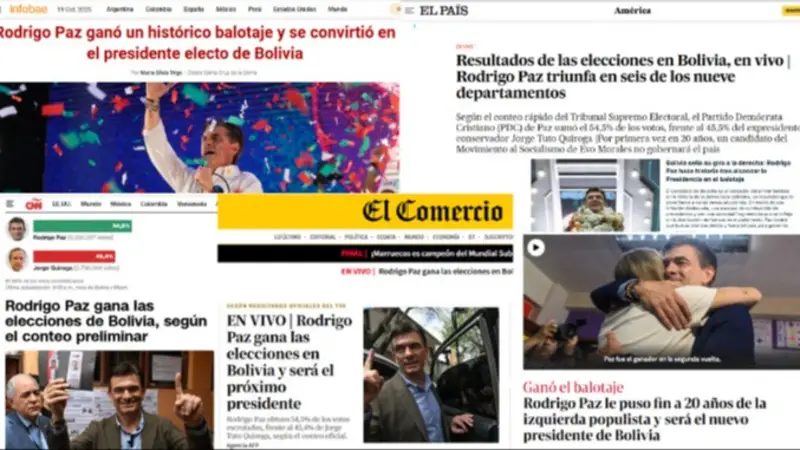 En Argentina, Clarín sintetiza el desenlace del balotaje afirmando que "Rodrigo Paz se impuso a Tuto Quiroga y es el nuevo presidente", mientras que en Perú, El Comercio destaca el fin de 20 años de socialismo con la victoria de Paz.