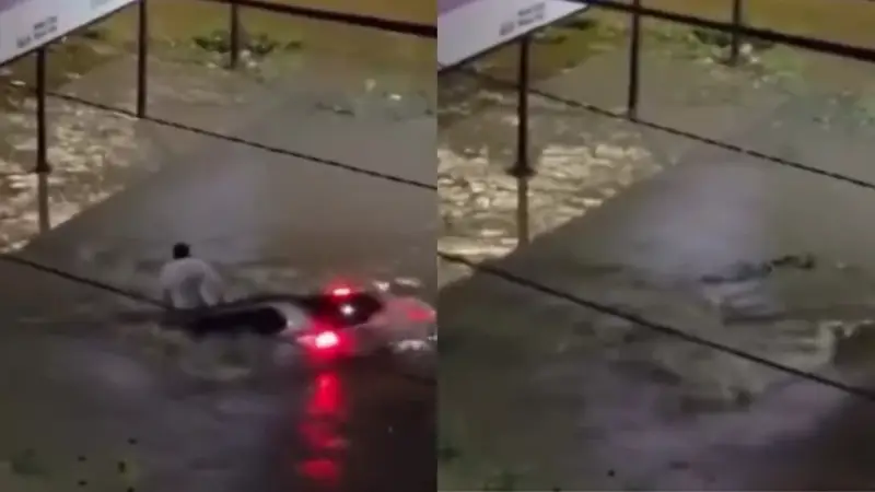 Las imágenes muestran al conductor reaccionando rápidamente al peligro. Al ver que el vehículo comenzaba a hundirse debido a la fuerza del agua, el hombre logró salir por la ventana y subir al techo del auto en un intento desesperado por salvarse.