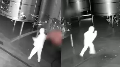 En las imágenes se observa a una persona, aún con uniforme de trabajo, acercarse a uno de los depósitos y abrir la válvula, lo que provoca la salida inmediata del vino. Posteriormente, intenta manipular un segundo tanque, pero no logra abrirlo. Segundos después, abandona el lugar de manera apresurada.
