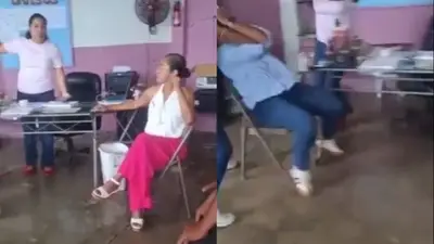 Un padre de familia captó el momento en que la educadora es atacada durante una reunión.