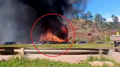 Un impactante video captó el momento exacto en que un autobús turístico, completamente envuelto en fuego y humo, avanzaba a toda velocidad por una autopista en el estado de Minas Gerais en Brasil. Las imágenes generaron pánico inmediato en redes sociales debido a la trayectoria errática del vehículo antes de abandonar la carpeta asfáltica.