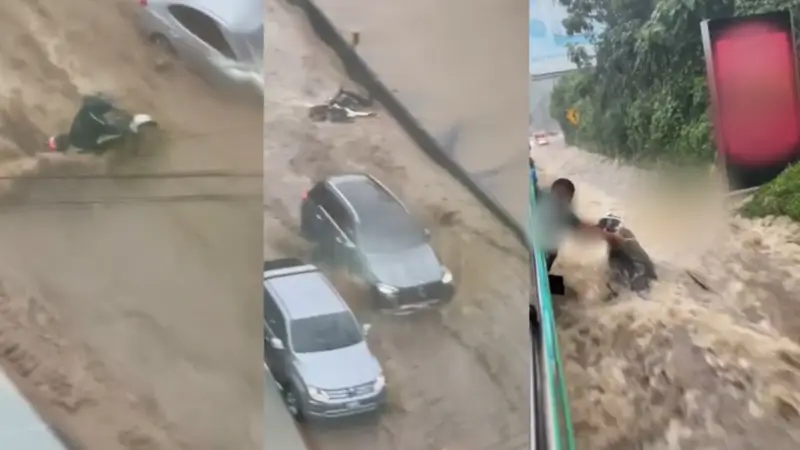 En impactantes imágenes captadas durante el fenómeno, se observa a uno de los motociclistas luchando por mantenerse en pie ante el arrastre del agua. Aunque logra sujetarse de la separación de un carril de cemento, su motocicleta es arrastrada por la corriente. Desesperado, corre por la otra vía con la intención de recuperar el vehículo de dos ruedas.