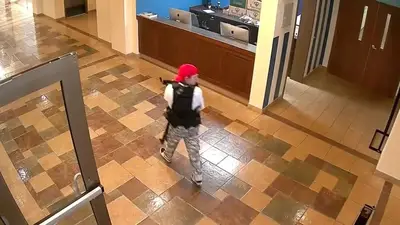 Parte de las imágenes aterradoras muestran al asesino, vestido con un sombrero rojo al revés, uniforme militar y un chaleco oscuro, deslizándose en varias habitaciones a través de puertas abiertas, aparentemente en busca de posibles víctimas.