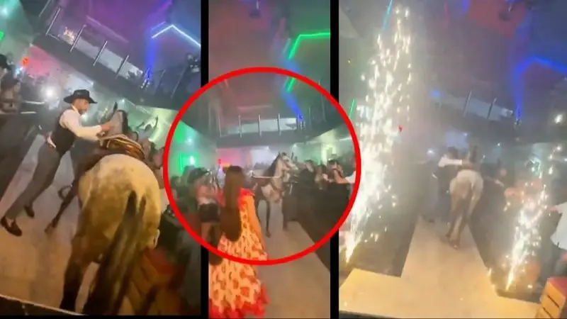 El clip, de apenas 30 segundos, muestra a un hombre jalando al animal hacia el centro del establecimiento mientras los presentes celebran, aplauden y gritan, sin importar la evidente incomodidad del caballo, que se mueve de forma nerviosa cerca de las chispas y el estruendo.
