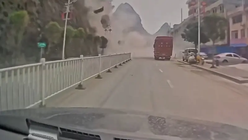 Un impresionante desprendimiento de rocas se registró en una carretera de la región de Fengshan, en China, donde enormes piedras cayeron desde una ladera, aplastando varios vehículos y generando escenas de pánico.