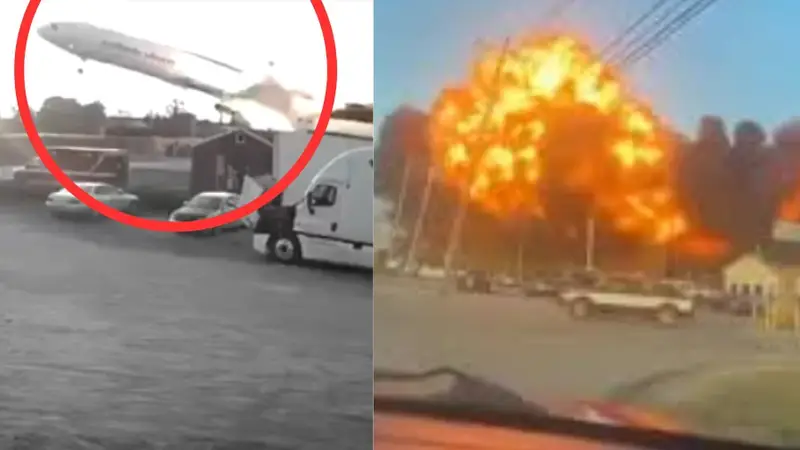 Las cámaras de seguridad captaron el instante en que la aeronave explotó en llamas tras colisionar contra varios negocios cercanos al aeropuerto, generando una densa columna de humo negro visible desde varios kilómetros.