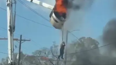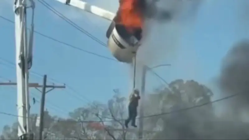 El dramático instante fue captado en video y comenzó a circular rápidamente en redes sociales. En las imágenes se observa al trabajador intentando mantenerse sujeto a la canastilla en llamas mediante su arnés de seguridad mientras el fuego avanza.