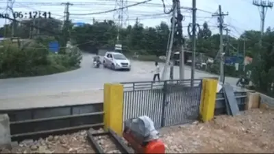 Cámaras de seguridad captaron un aparatoso accidente en la India. Las imágenes muestran el momento exacto cuando un vehículo casi impacta contra un motociclista y seguido logra arrollar a un peatón.
