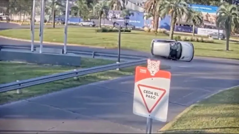 Las imágenes de seguridad muestran cómo el vehículo “patinó” más de 50 metros antes de volcarse, en una escena que rápidamente se viralizó en redes sociales.