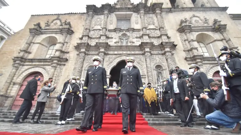 Previamente, los restos mortales fueron bendecidos en la Basílica de San Francisco, luego fueron colocados en un vehículo militar y trasladados en un desfile militar con cuadrillas de la Fuerza Aérea, el Ejército, la Armada Boliviana, y los Colorados de Bolivia. El presidente Luis Arce Catacora encabezó la comitiva junto al vicepresidente David Choquehuanca, los presidentes de las cámaras de diputados, Freddy Mamani, y de senadores, Andrónico Rodríguez, además de los ministros de Estado y autoridades del Alto Mando Militar y de la Policía.