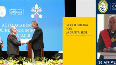 “Lo que ofrecemos a Bolivia como Universidad Católica Boliviana, nuestra propuesta de valor, lo que nos diferencia, nuestra identidad, es el ser una Universidad Católica… si la palabra universidad expresa la aspiración a una totalidad, la universalidad del conocimiento, católica significa, lo mismo: universal”, resaltó el rector.