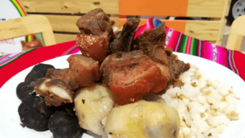 | 1.- | Colocar en una sartén o paila la carne de cerdo ya cortada, agregar 1/2 litro de agua y la chicha, los dientes de ajo picados, el comino, la sal, el jugo de limón y llevar a cocción a fuego bajo por lo menos 40 minutos, o hasta que el cerdo este tierno, o el agua se halla evaporado en un 90%. | |