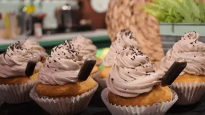 | 5.- | Vierte la masa dentro de los moldes preparados, llenándolos hasta tres cuartas partes de su capacidad. Hornea hasta que se sientan esponjosos al tacto, aproximadamente 20 minutos. Retira del horno y deja enfriar dentro de los moldes durante 10 minutos. Luego desmolda y coloca sobre rejillas de alambre para que se enfríen completamente. | ||