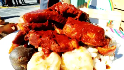 - Servir en plato, trozos de cerdo cocido y regado con la salsa de ají rojo, acompañar con las papas cocidas, arroz cocido y yuca cocida.