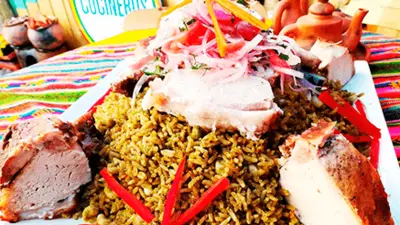 | - Cuando el arroz esté a punto, servir en platos, poner encima las costillitas y salsa criolla al costado. Si se quiere también se puede agregar un poco del juguito, en el que se coció el cerdo.