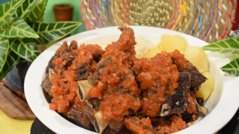 5.- Servir las costillas doradas con arroz y papas cocidas, regar con salsa picante.