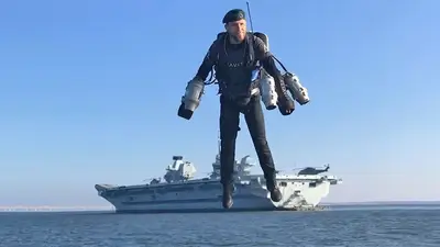 El fundador de Gravity Industries despegó este jueves desde la cubierta del portaaviones HMS Reina Isabel, y sobrevoló un yate